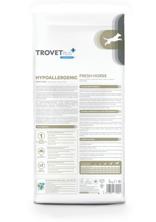 Trovet has built its reputation by offering scientifically formulated diets developed alongside veterinarians and animal nutrition experts. The Trovet Plus Hypoallergenic Horse Veterinary Diet is trusted worldwide for dogs who require specialized care due to food allergies or intolerances.